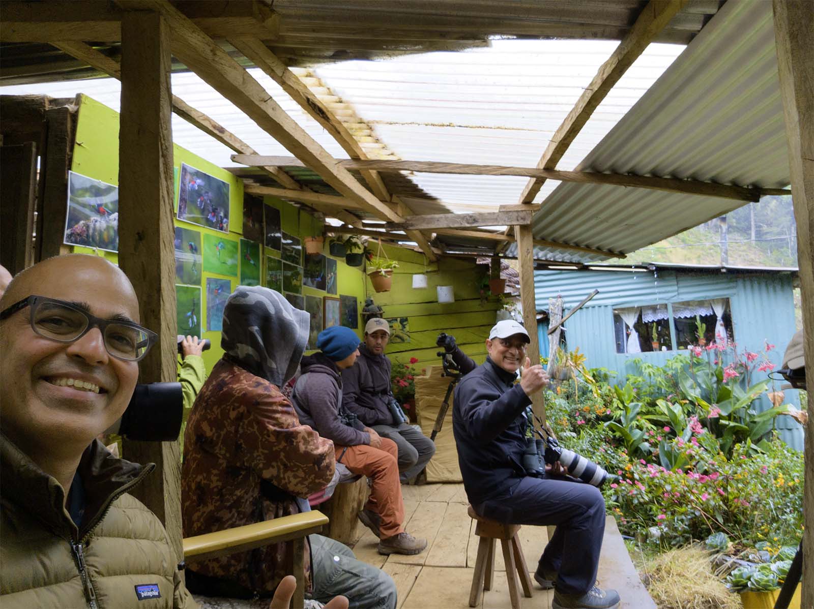The stage was a curious blend of the wild and the curated. The nesting tree was situated between the shacks and a steep, densely vegetated hillside. Before the hill rose there was a long branch artfully adorned with bromeliads that I later learned was occasionally used a perch by the Quetzals and was there for set design. There were two viewing platforms, one had a couch against a wall and simple stools and provided a good view of the hillside and the perch but an angled view of the nesting tree. The other, where most of the photographers had gathered had a perpendicular view to the nesting tree and would be perfect if the Quetzal took a linear flight path - aka the 'money shot'.