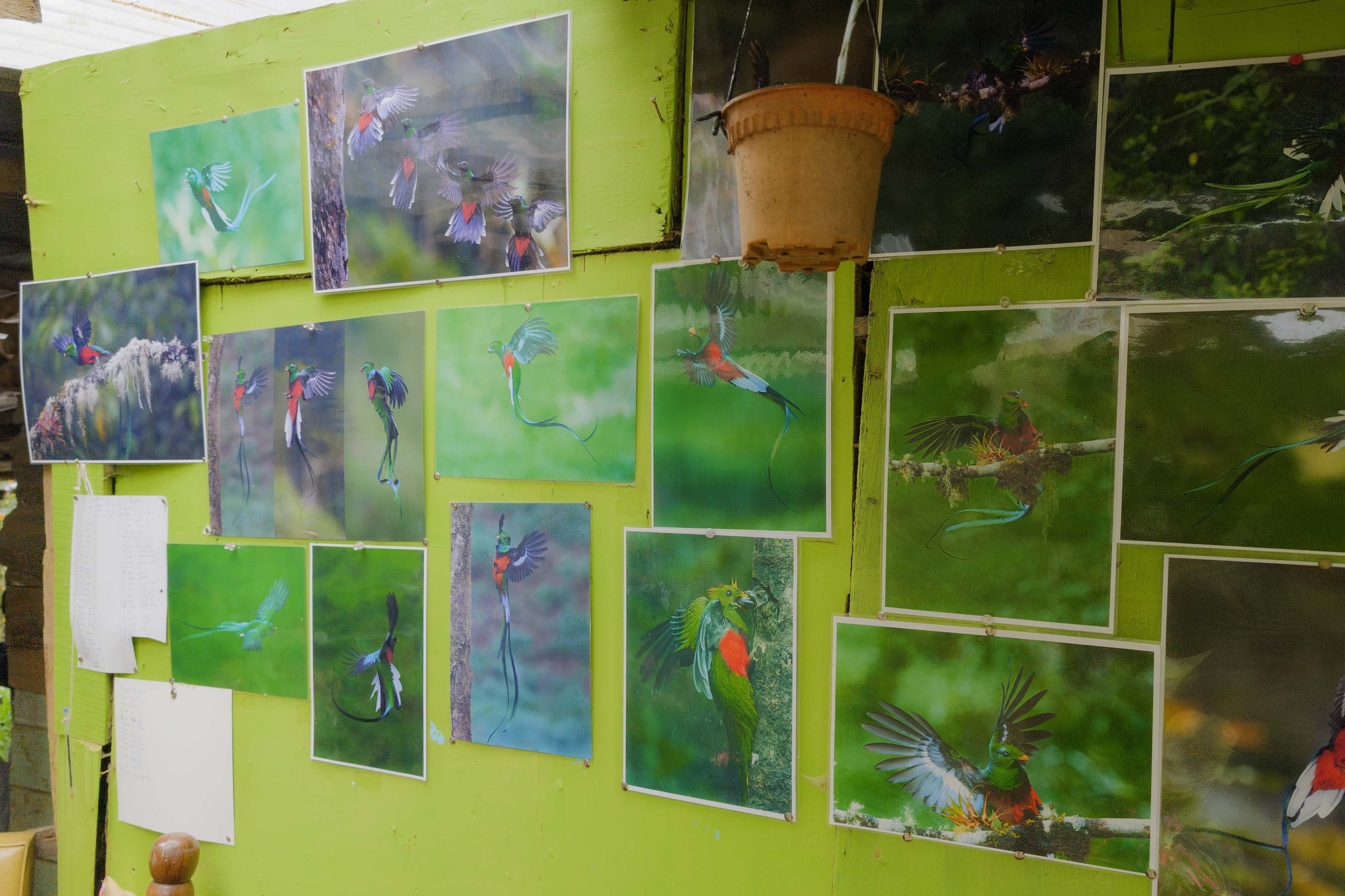 I retreated back inside the viewing platform and this time I politely requested the photographer in front of me if he might consider remaining seated. My brother, meanwhile, was having the time of this life, with a clear view of the flying Quetzals and unburdened by the tyranny of the 'perfect shot'. We took selfies, grinning happily that we had yet again seen the Resplendent Quetzal and this time it was the female as well. I admired the gallery of photos that was tacked on the wall, action shots and portraits of activity around the nest.