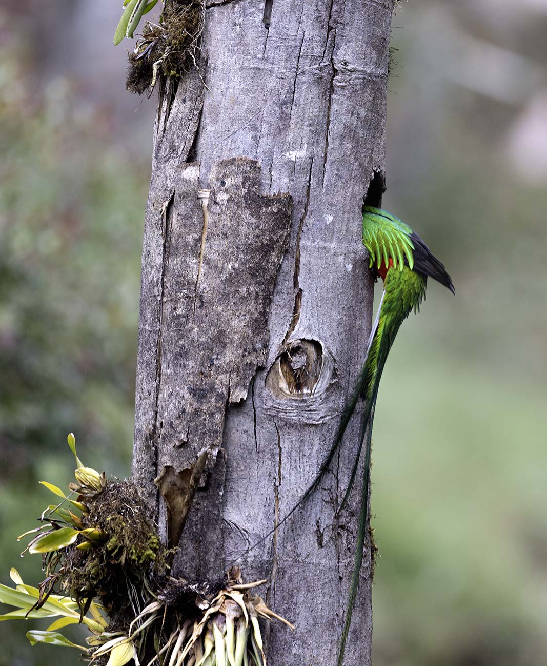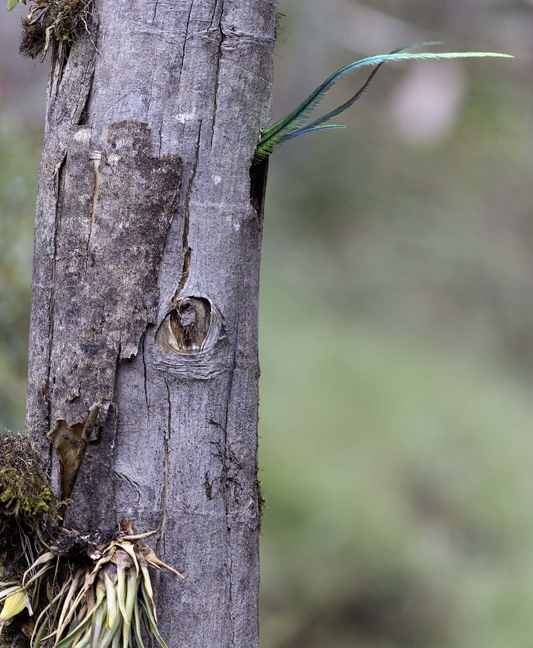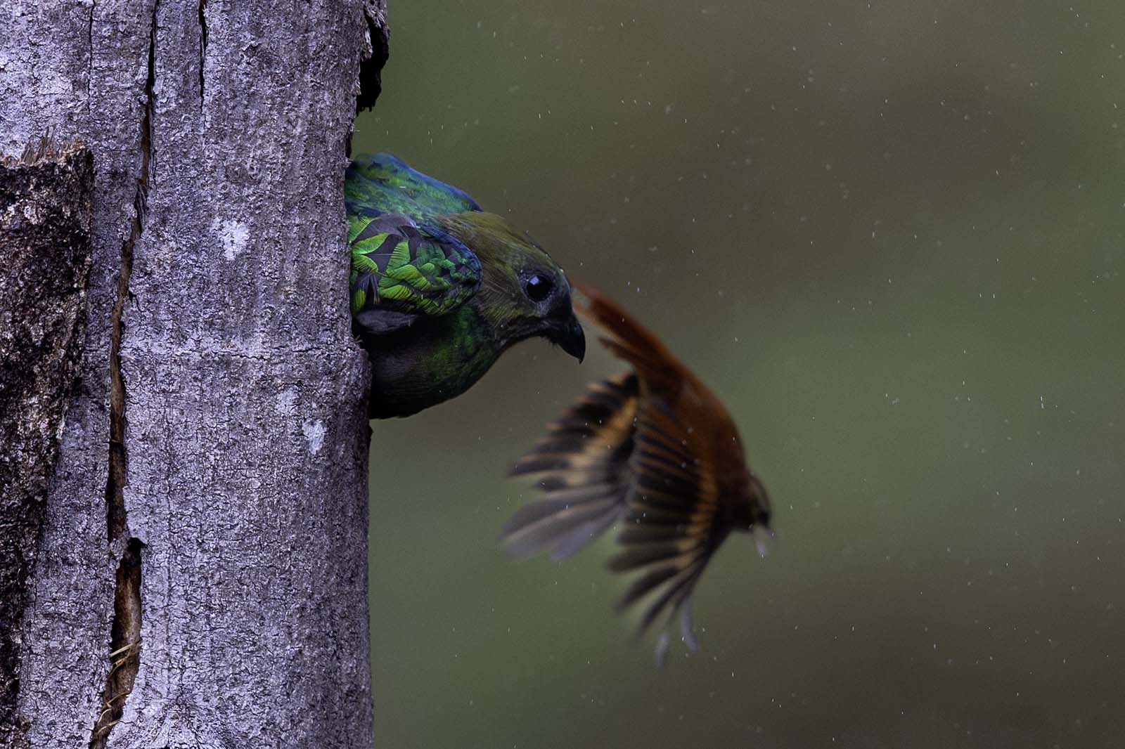 Another exclamation shot - and I had barely turned my head towards the opening that I saw it: a shimmering ripple of green, the male making a beeline for the nest. I mashed the shutter button, panning in desperation. The Quetzal sticks a perfect landing on the tree lands and in an incredible acrobatic move enters the nest. As I review my photos I see another problem with my vantage point. The Quetzal flew a path at an angle to the plane of my camera and several of my photos missed their focus.