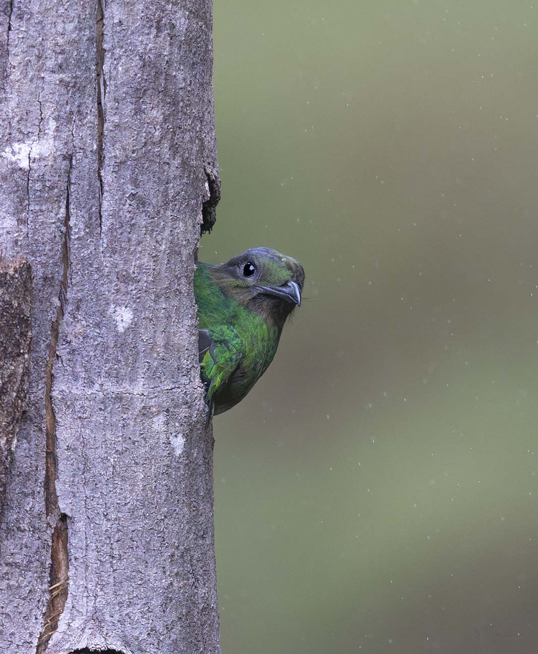 My brother took the former platform and got comfortable on a stool with his camera and binos. I stood behind a row of photographers who had taken first dibs on the platform placement and right away I could see there was a bit of an issue. Even with my tripod elevated, I had a narrow view of the nesting tree framed by the backs and shoulders of the photographers in front of me. But there is no time to change positions anymore as a small cry goes out and the female Quetzal is seen, poking her head from the hole (photos).