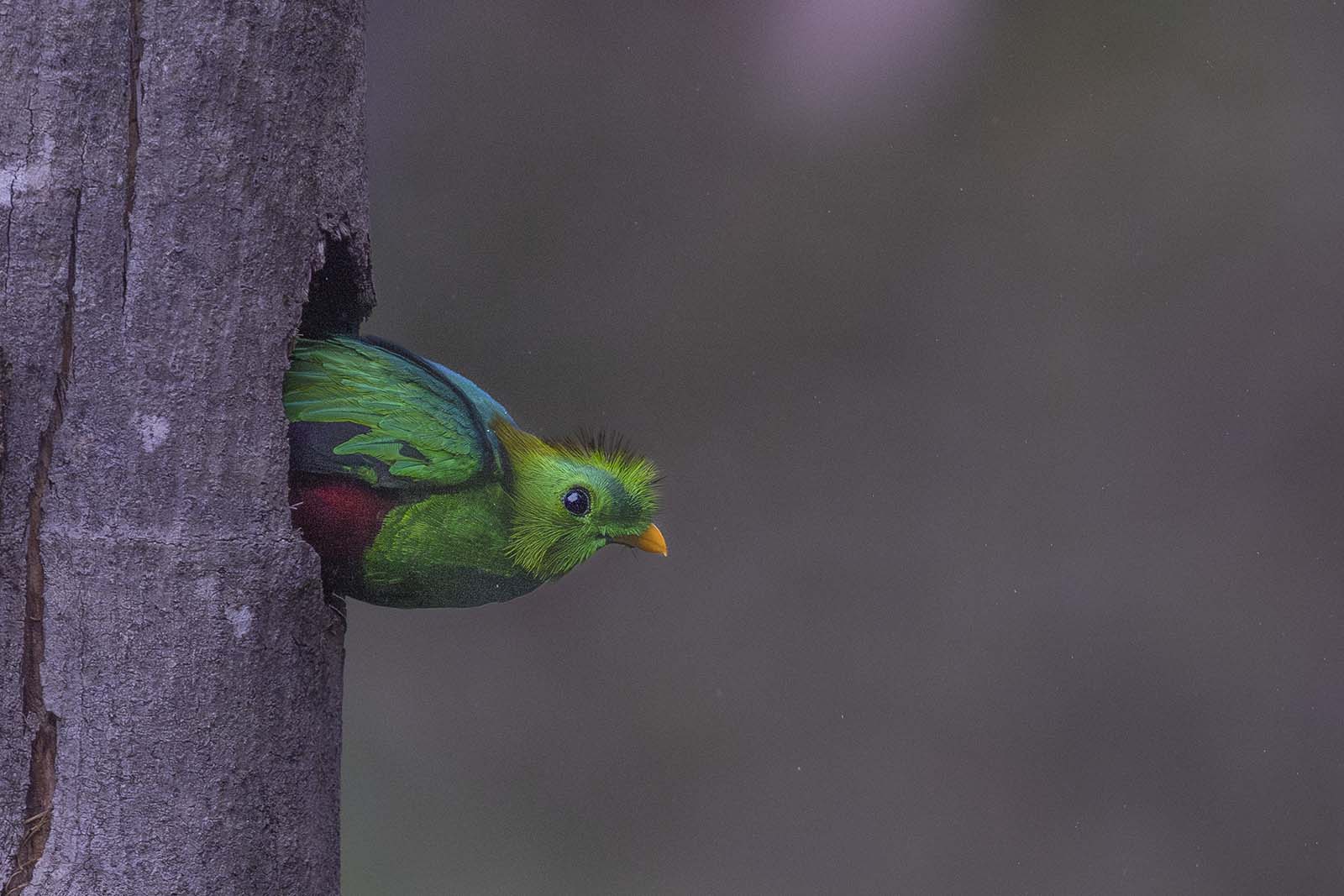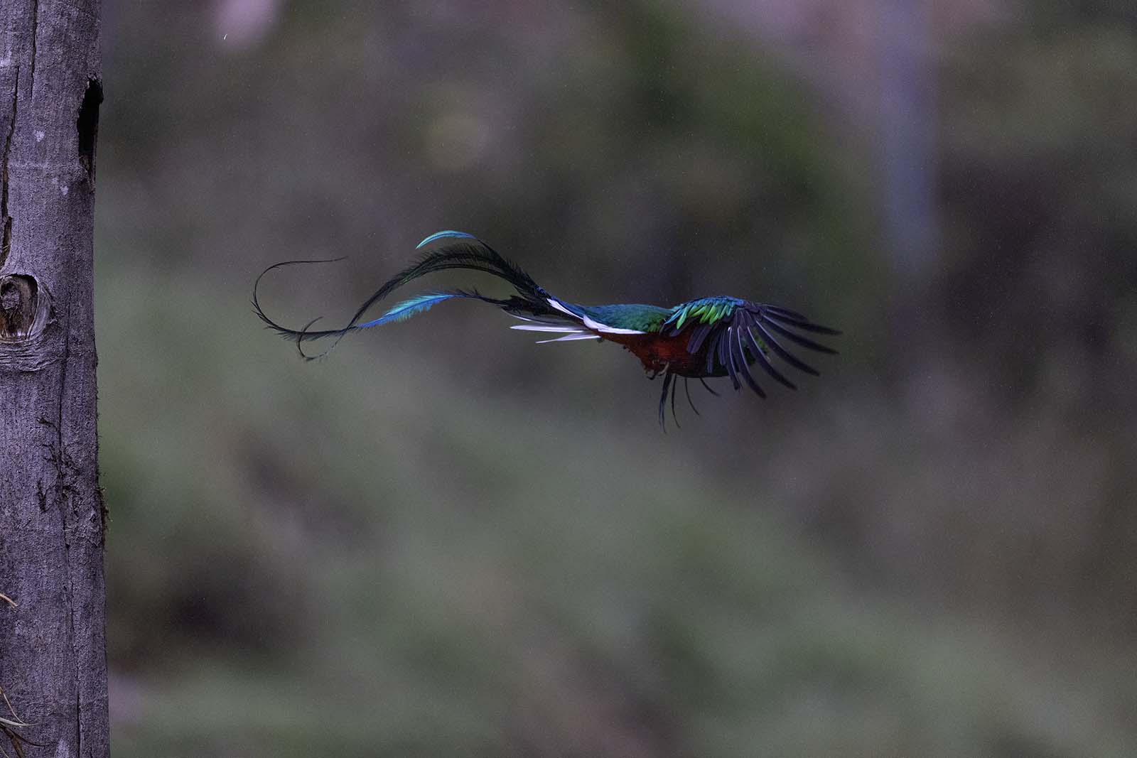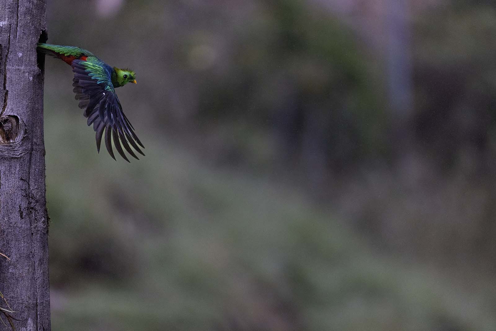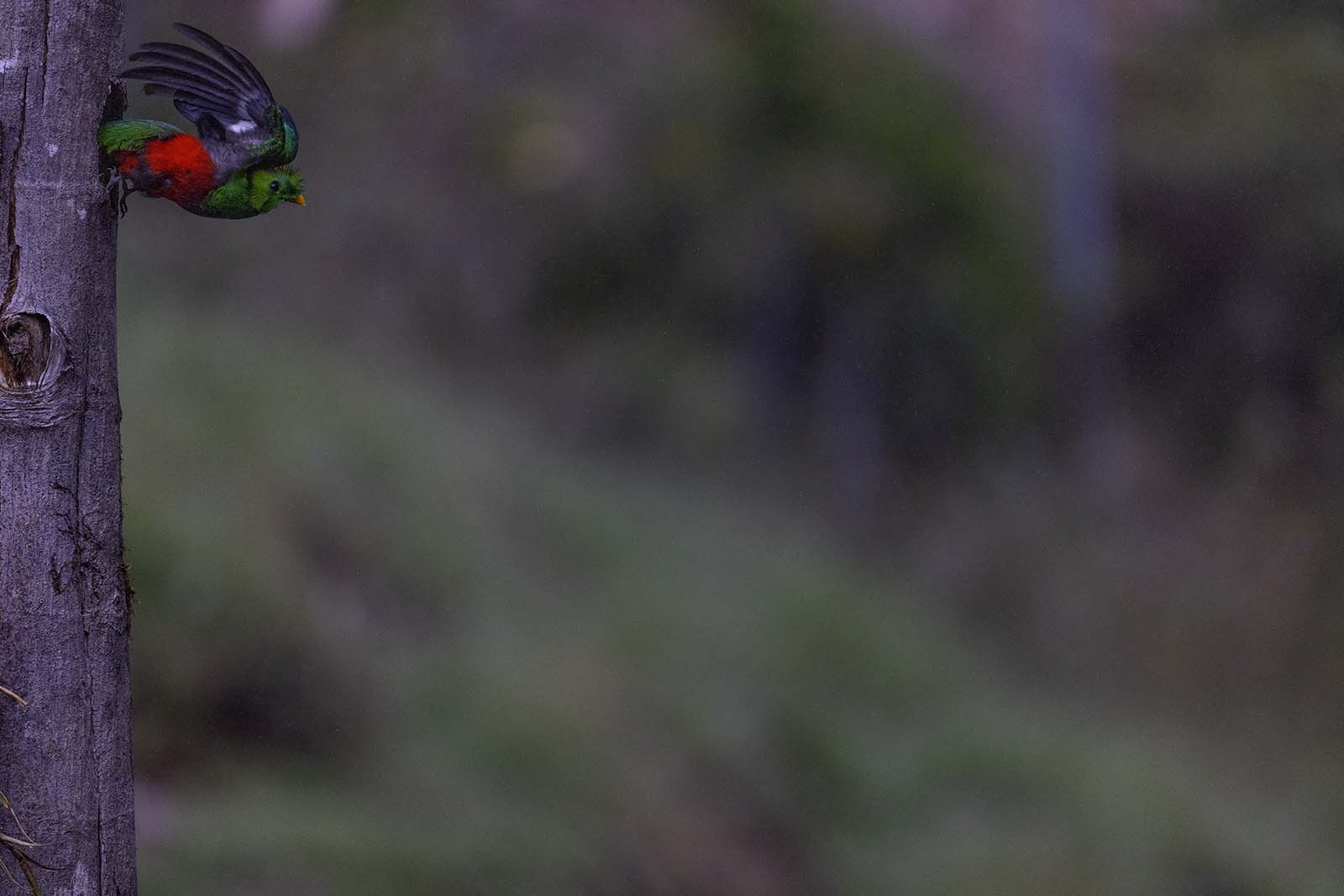 Another long wait and there is a sense in the crowd that this is the last chance to see the Quetzal before we lose the light. It is not possible to pan my long lens, as the action that unfolds is over in a couple of seconds and the Quetzal essentially fills my frame, so I keep my lens locked at the tree. The male Quetzal does not disappoint. Arriving in a flourish, it performs a sudden mid-air brake, wings spread wide, its small feet reaching for the edge of the nesting hole. Another set of rapid fire images, arranged as a carousel show the Quetzal's re-entry.